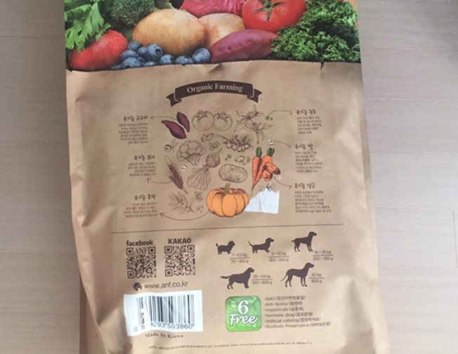 6free 강아지 사료는 유기농 녹두, 유기농 쌀, 유기농 당근, 유기농 호박, 유기농 보리, 유기농 고구마로 구성되어 있습니다 조지방은 10%이상 칼슘은 1% 이상, 조섬유는 6%이하, 조회분은 8%이하, 인은 0.4%이상, 수분은 11% 이하, 조단백질은 26% 이상입니다 4.5kg 이하의 아이들은 20~100g을 먹여야 하고 5~10kg의 아이들은 100~200g을 먹여야 합니다